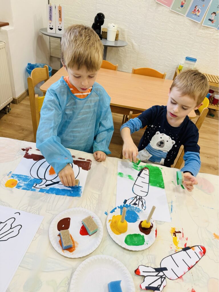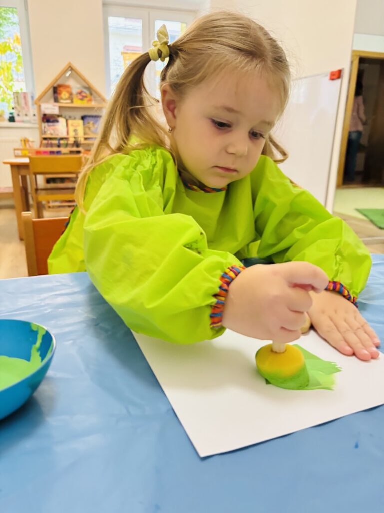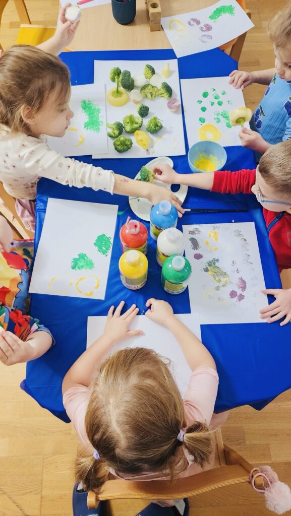 V tvorivej časti deti maľovali zeleninu aj so zeleninou, otláčali tvary listov a plodov, experimentovali s farbami a vytvárali veselé obrazy 🎨.